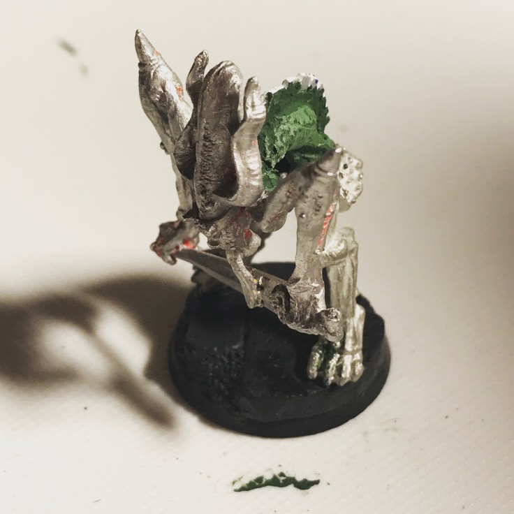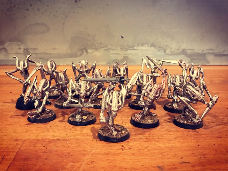 All of the Bloodletters had a good soak to get the old paint off. After that it was clean up time, removing casting flash and seam marks, pinning and gluing them together and basing them up.