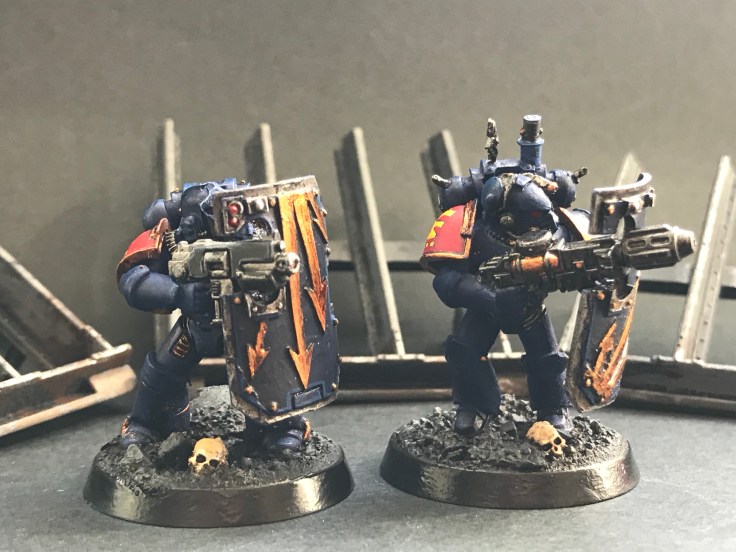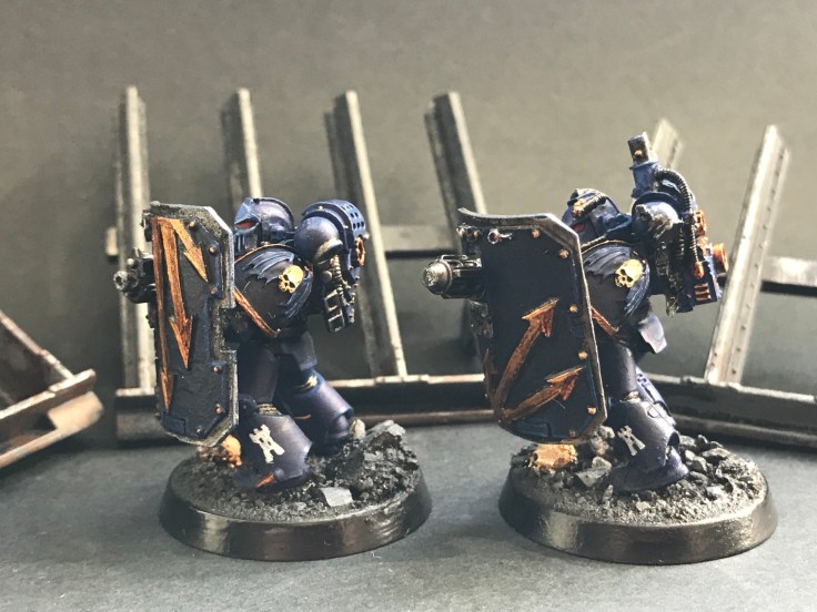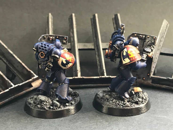 They had all been made up as Ultramarines, so there has been some work to remove those chapter markings and replace with the markings of the Night Lords.