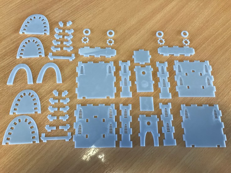 This includes this acrylic cut and etched Genatorium building from Honey Bee Works. I thought that it will add a bit of variety and a focal point for an industrial zone.