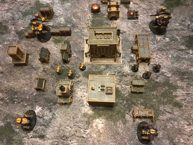 The knights closed in to effective weapon range and started trading volleys down the central city valley. They never made it into close combat before the game ended prematurely and in the mean time the ion shields did a great job in protecting the Questoris.