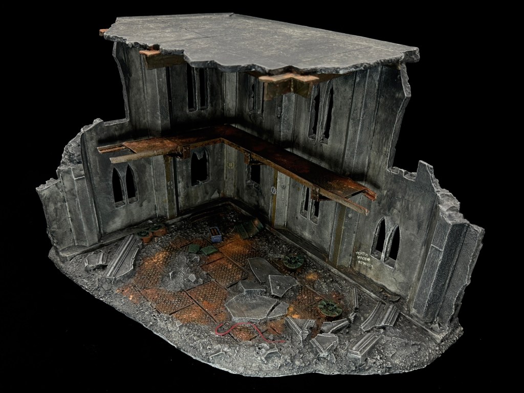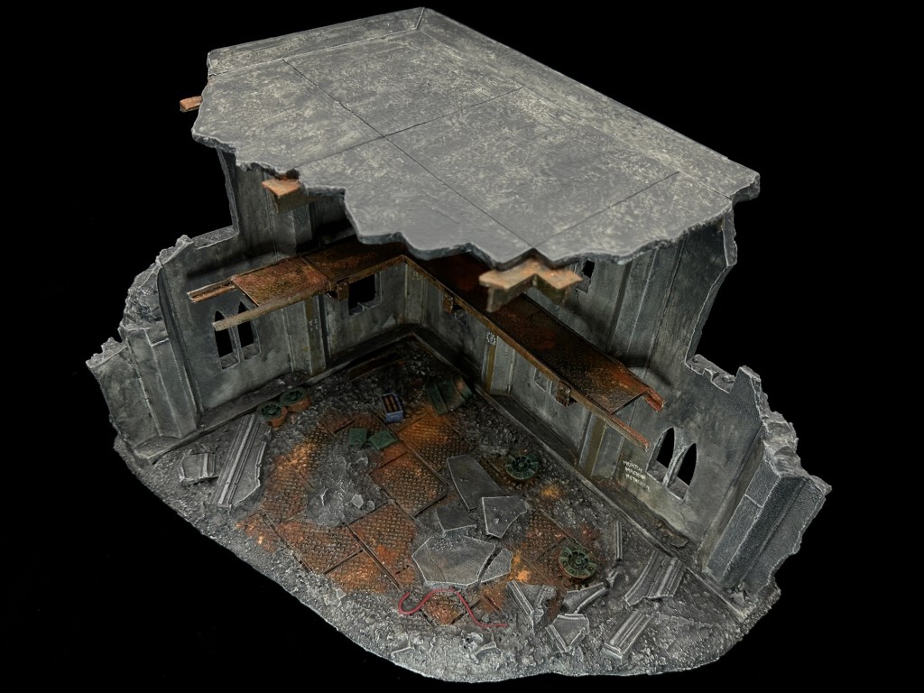 The original product description was that this is a complete multi-part resin model. Superbly detail Ruined Tank Factory, with interior walkways, roof and details such as tank wheels and ammo boxes. The building is 12 inches (30cm) in length and 8 inches (22cm) across.”